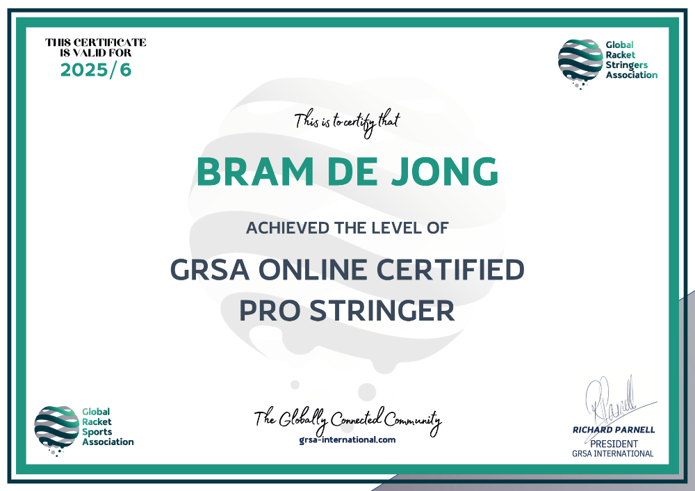 De Global Racquet Stringers Association (GRSA) is een toonaangevende internationale organisatie die de hoogste standaarden stelt voor racket-specialisten. Het “Pro Stringer” certificaat is niet zomaar een papiertje; het is een bewijs van vakmanschap, precisie en diepgaande kennis. Het betekent dat ik: