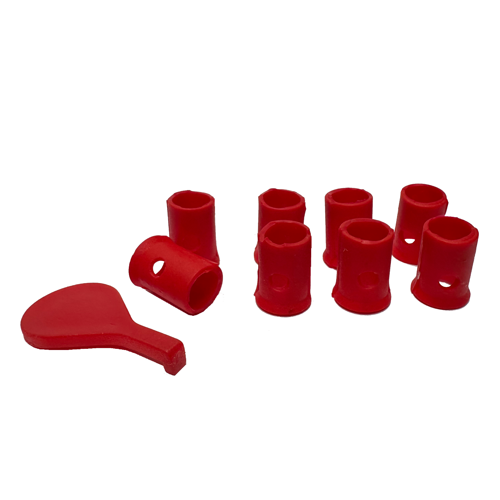 Eenvoudig te installeren: kies de gewenste gaten, plaats het smalle uiteinde van de demper en duw totdat het breedste deel onder het racketblad vastklikt. Herhaal aan de andere kant (1 gat = 2 dempers). Om te verwijderen, gebruik je de meegeleverde sleutel om de demper voorzichtig uit het gat te trekken.